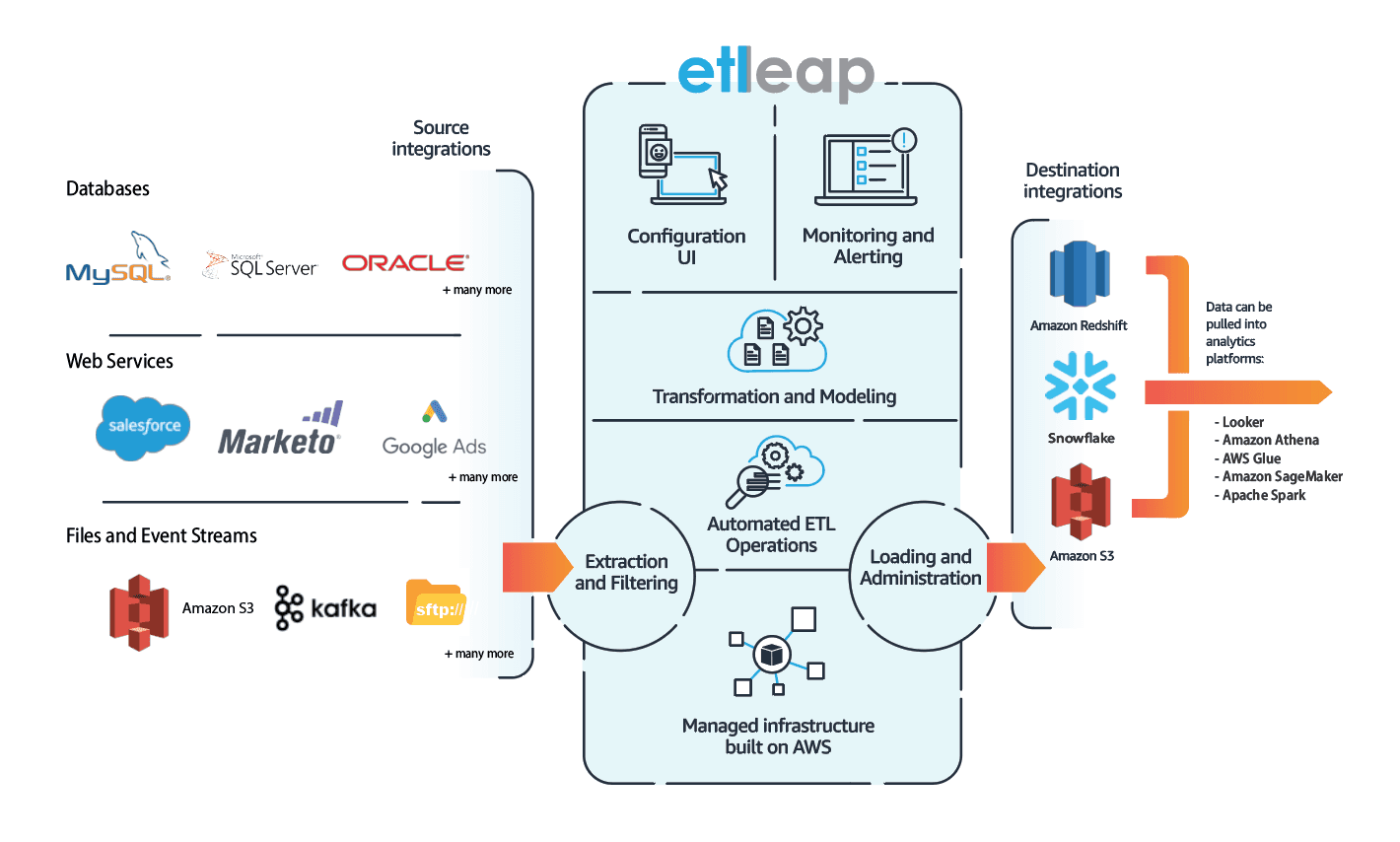 Etleap is devoted to helping teams build data warehouses and data lakes on AWS, and we offer both hosted and in-VPC deployment options. Like Snowflake, Etleap takes advantage of AWS services such as S3 and EC2 to provide performance and cost benefits not possible with traditional ETL solutions.