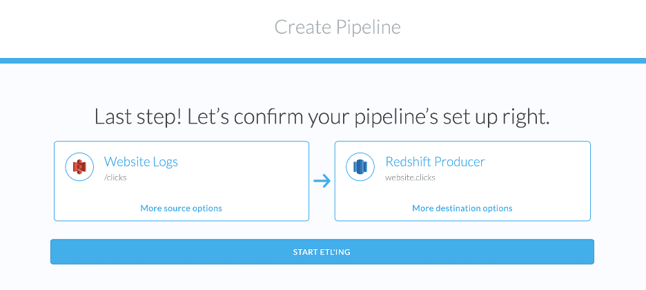 At this point, Etleap has configured sharing from the producer cluster to the consumer cluster. The final step is to create an ingestion pipeline for the click data from Amazon S3 into the producer cluster, which involves going through Etleap’s pipeline setup wizard and interactive data wrangling.