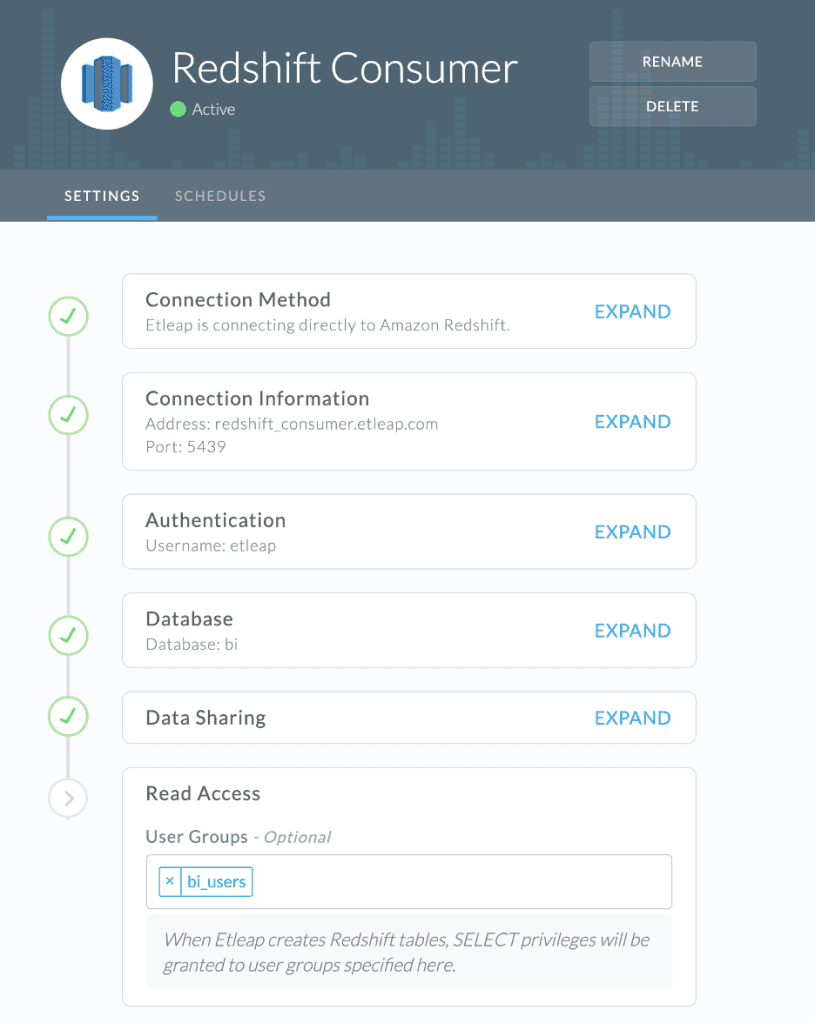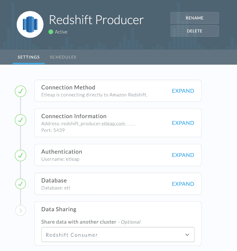 Here’s how to configure the data pipeline described in the example above in Etleap, where data ingested into a producer cluster is shared to a consumer cluster using data sharing.