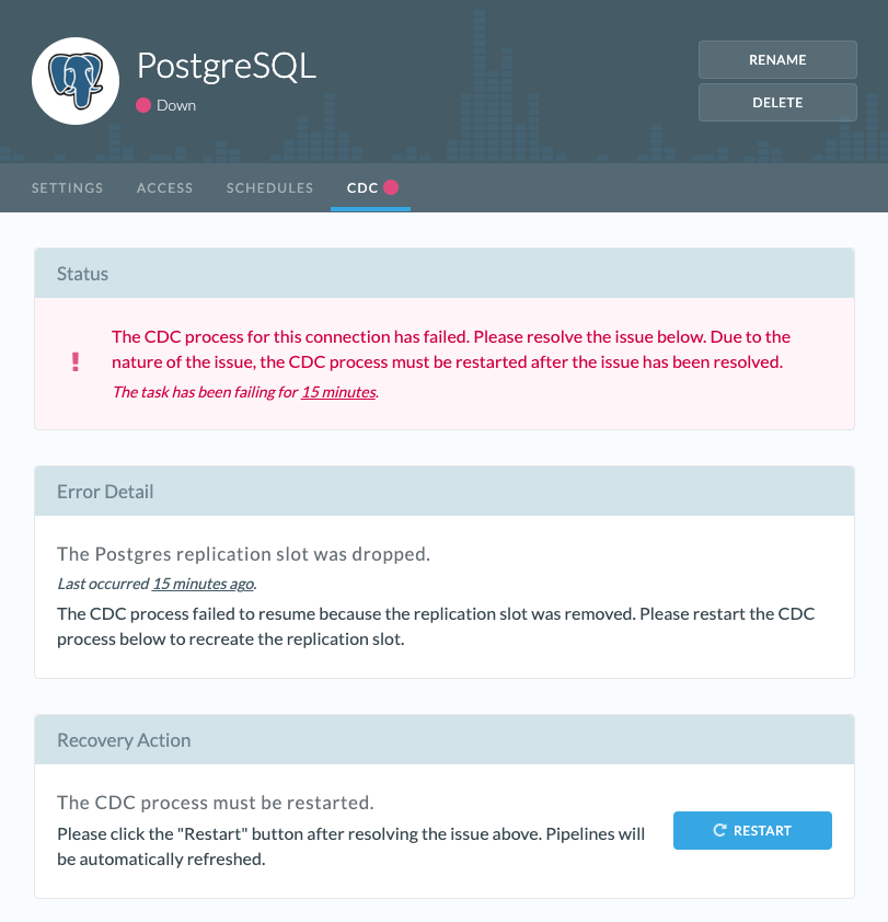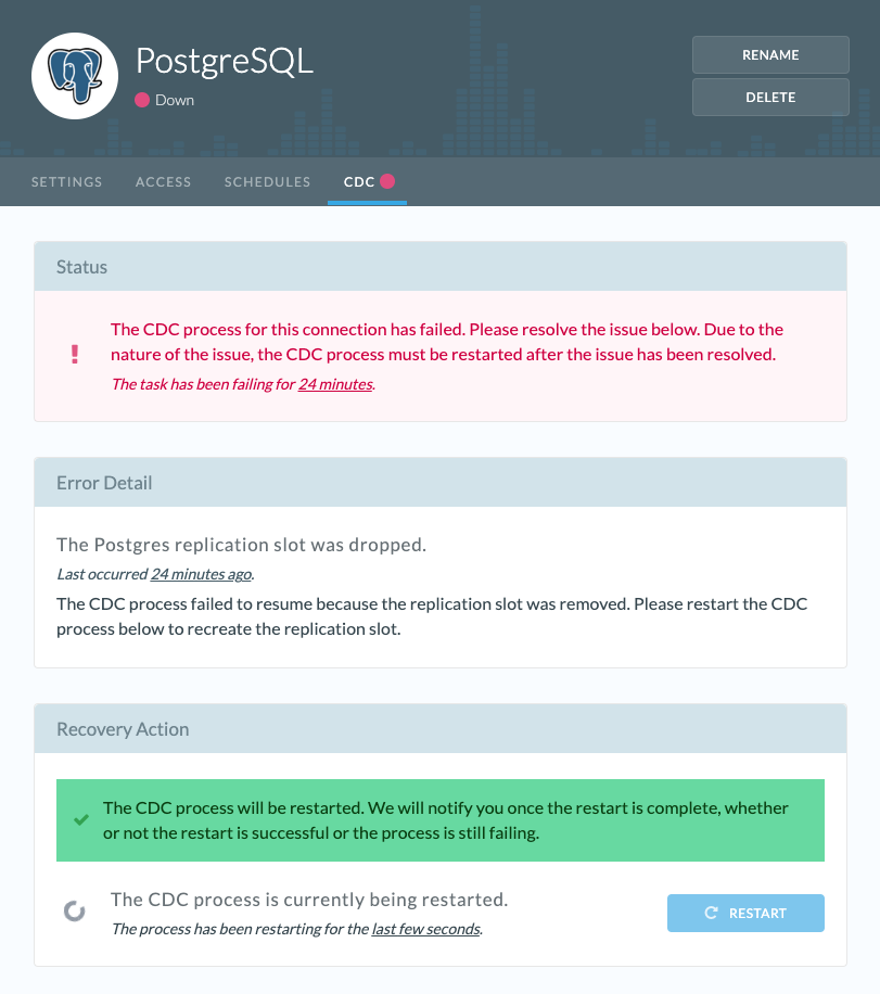 Etleap is able to parse and interpret errors that occur in AWS DMS. It then presents this information as specific instructions to return the CDC process to an operational state. This gives a less technical user the power to monitor and manage CDC replication directly without needing to involve an engineering team. If it’s an unknown error, Etleap’s team of support agents are alerted and engaged to help resolve the issue. After the issue has been resolved, Etleap restores the data integrity by automatically re-syncing the source to remove any gaps in the data.