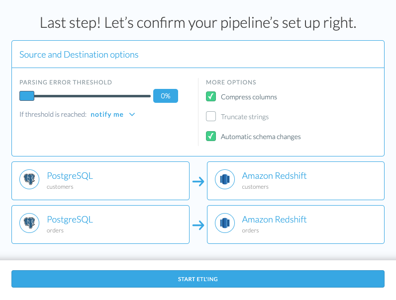 From this point, Etleap will manage the pipeline, detect any changes to the data or the table schema, and notify you of any errors or required actions. Etleap will monitor for data correctness and latency to ensure both data integrity and recency meets the requirements you set.