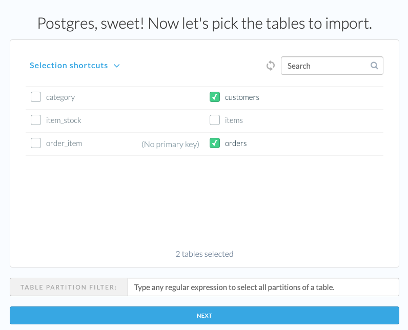 Etleap automatically handles the creation and configuration of the endpoints and tasks in AWS DMS, which capture changes to these tables from the PostgreSQL Write-Ahead Log (WAL).