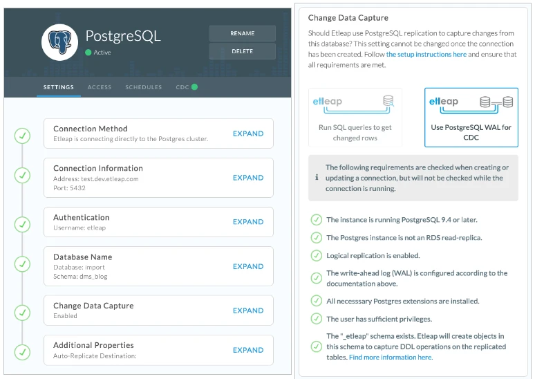 The first step is to configure the PostgreSQL source connection in Etleap, ensuring that CDC is enabled and that all prerequisites are met. Etleap automatically validates all requirements before creating the connection, ensuring that the source is configured correctly for AWS DMS.