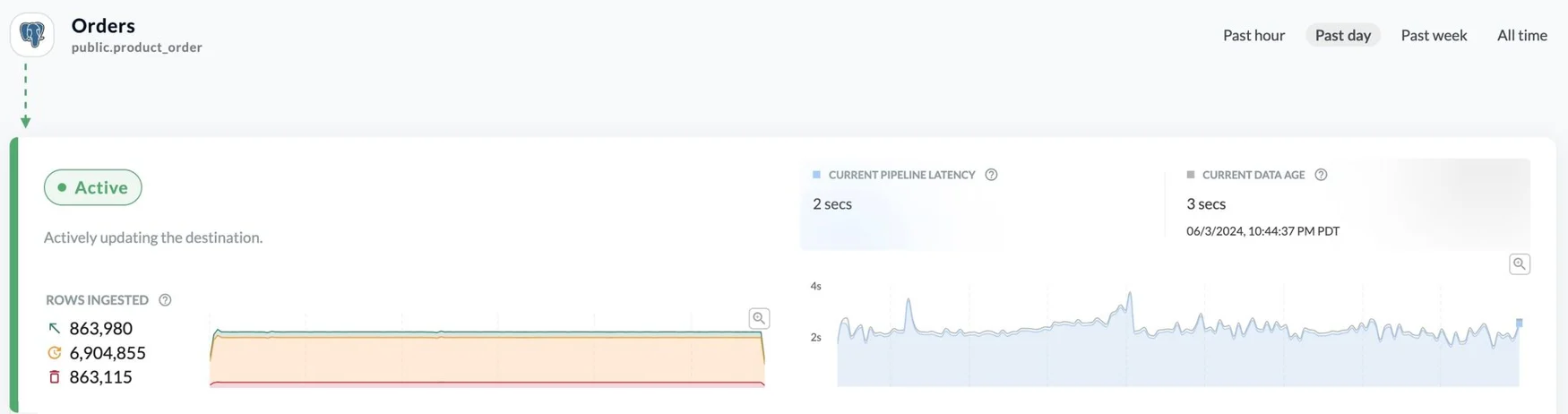 Below is a screenshot from an Etleap pipeline that is ingesting data from a Postgres database to Iceberg, which is connected to a Snowflake data warehouse. Despite handling over 4B records, the data available for querying in the destination warehouse is only seconds old.