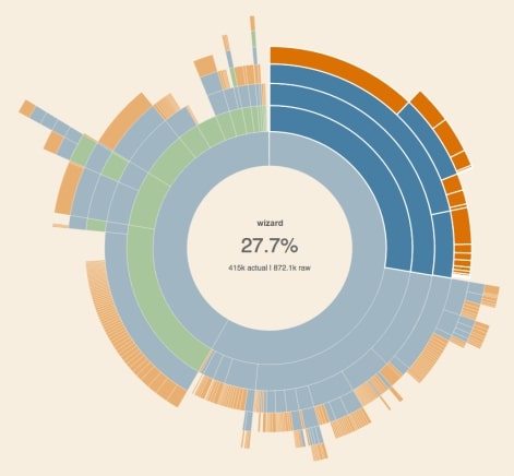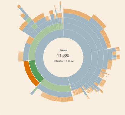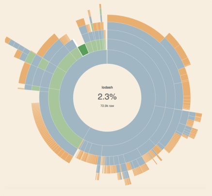 The chart is categorised by folders, with the root folders at the innermost layer of the chart. Files are orange, folders blue, and dependencies are green. By hovering any slice, the size of the slice relative to the bundle is shown. This makes it easy to identify parts of the application that can be optimized for load time.