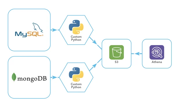 These constraints led to the manual build of lengthy Python code. The code extracted data from MySQL and MongoDB, fed it into Parquet files, deposited it in Amazon S3, and then queried it using Amazon Athena. The Python processes took hours and required significant amounts of memory, which was not only time-consuming but limited the range of new projects the team could pursue.